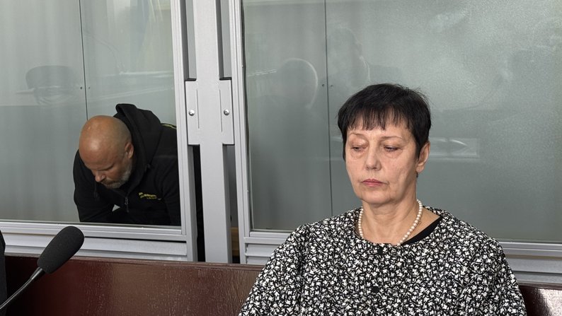 Мати Марії Холодної поруч зі скляною кліткою, де перебуває чоловік її доньки, якого обвинувачують у вбивстві. Суспільне Харків/Лариса Говина