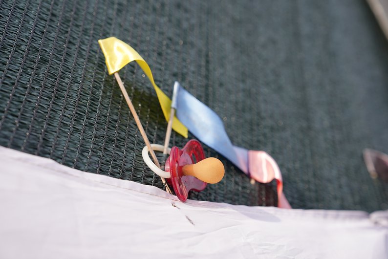 Дитяча соска-пустушка з жовтим і блакитним прапорами, прикріплена до пам’ятника, листопад 2025 року. Суспільне Харків/Олександр Манченко