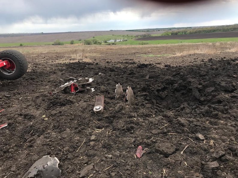 Вирва від міни, яка влучила в поле. Вирва від міни поблизу села Макарове на Золочівщині. 11 травня 2023 року. Фото: голова Золочівської громади Віктор Коваленко.