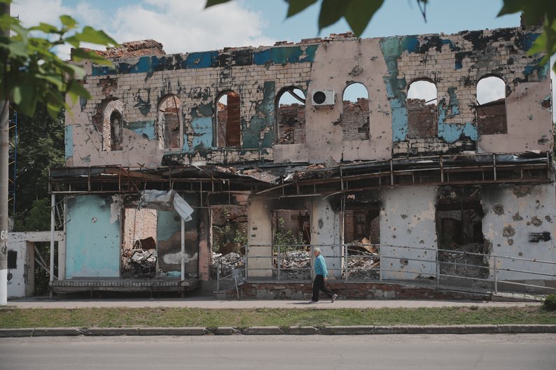 Зруйнована внаслідок обстрілів росіян будівля в Ізюмі. Суспільне Харків/Вікторія Якименко