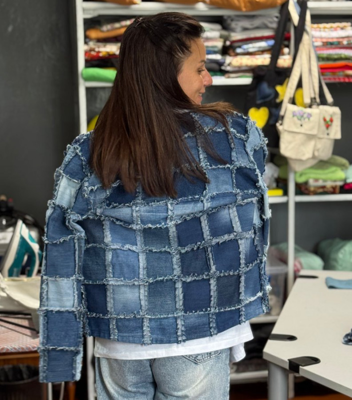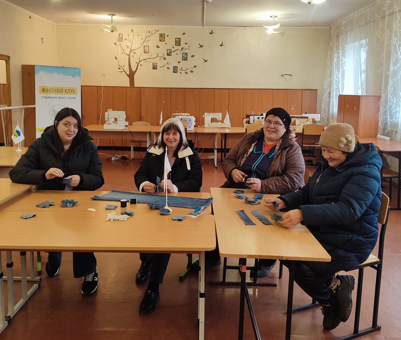 Жінки на занятті в “Жіночому клубі” на Харківщині шиють вироби зі старих джинсів. Команда ГО “Звичайні люди” Ми побачили, що там серед речей є такі, в яких можна щось обрізати або пришити, і вийде ще одна річ, більш модна. Ця ідея виникла через екологічний напрямок, і жінкам це сподобалося, тому що вони мали можливість принести свої речі власні з дому, переробити їх, зробити зі старої нову річ. Це дало другий шанс речам.