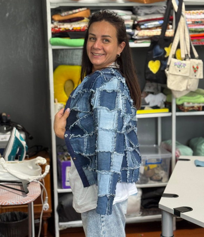 Ольга Галічева в кофті, яку пошили учасниці “Жіночого клубу” зі шматочків старих джинсів. Фото надала Ольга Галічева
