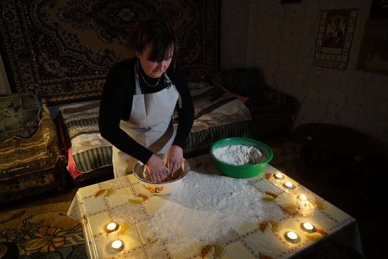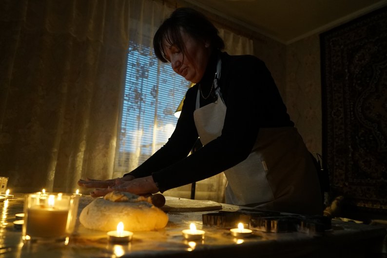 Наталія Кабашна робить “панянки” при свічках: через проблеми в енергосистемі України в громаді Наталії вимикають світло, грудень 2025 року. Суспільне Харків/Валерія Ємець