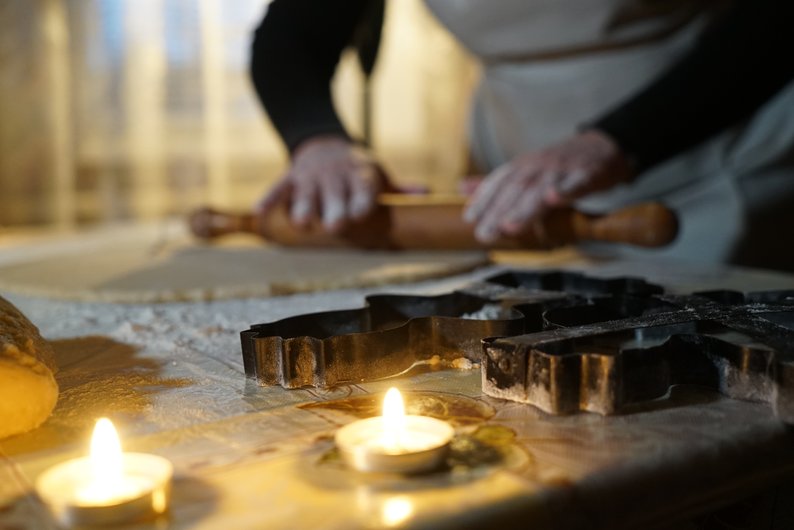 Наталія Кабашна розкатує тісто на “панянки” при свічках, грудень 2025 року. Суспільне Харків/Валерія Ємець