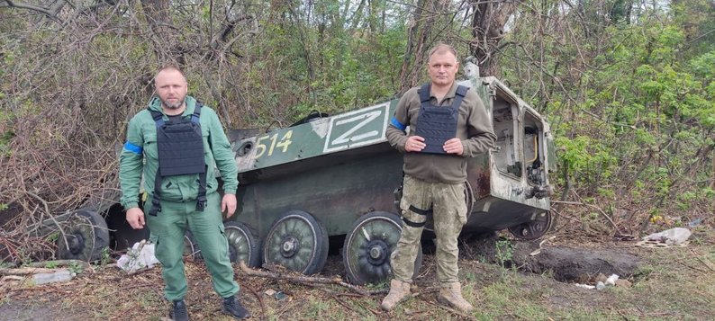 Євген Шпінда та учасник добровольчого формування територіальних громад в Богодухові біля російського танка. Фото надав Євген Шпінда