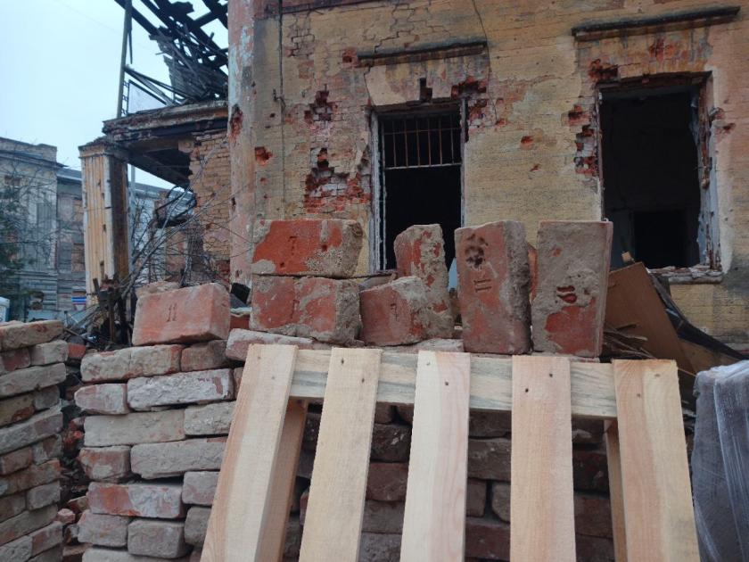 “Намагалися зібрати все, що мало цінність, проте ступінь руйнації була дуже серйозна, тому врятувати ми могли лише цеглу. Основний фасад був втрачений одразу, комунальники ще в 2022 році його вивезли, тому ми працювали лише з дворовою частиною цієї будівлі та з сусіднім будинком №6, від нього залишилися два фрагменти стіни”, — розповів KharkovNEWS.info Віктор Дворніков, архітектор-реставратор та заступник голови робочої групи з оперативного реагування на руйнування об’єктів культурної спадщини.