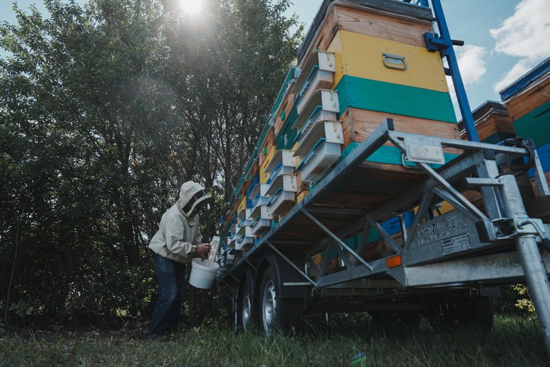 Пасічник Андрій Іванов працює на новій пасіці у Валківському районі, серпень 2025 року. Суспільне Харків/Вікторія Якименко