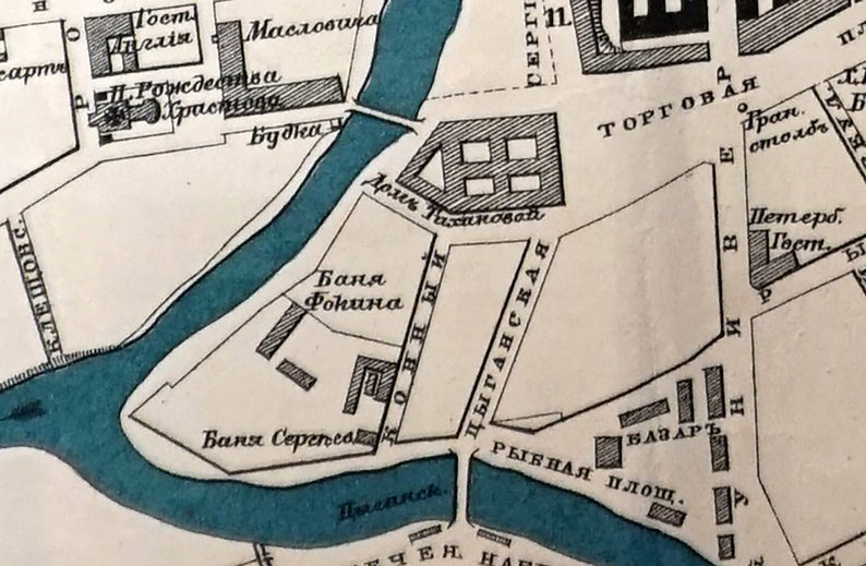 Фрагмент мапи Харкова 1875 року з зображенням лазні Фокіних, лазні Сергієвих та Рибного ринку. Фото надав Андрій Парамонов