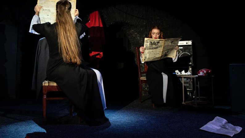 Виставу "Залишити або залишитись" на сцені грають дві акторки — вони передають діалог між собою.