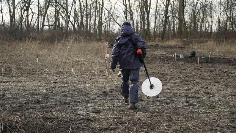 Демінер The Halo Trust під час перевірки території на Харівщині. Фото: Валерія Ємець/Суспільне Харків