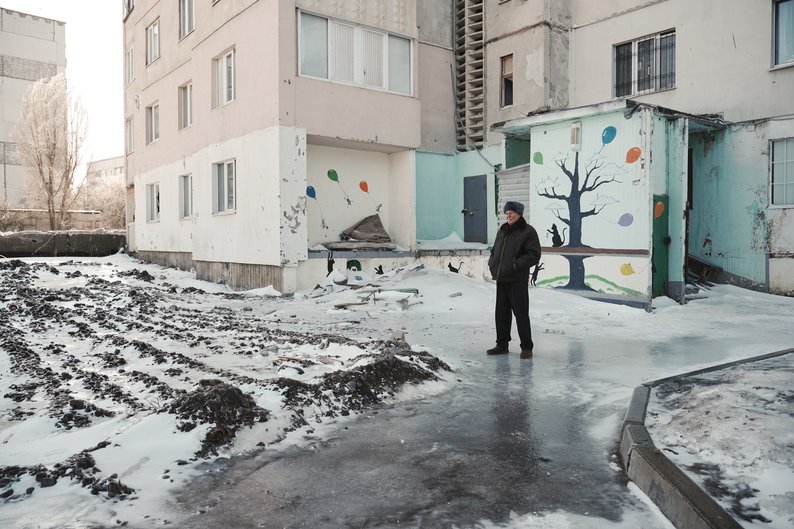 Григорій Гладиш, єдиний житель однієї з 16-поверхівок Північної Салтівки, Харків, лютий 2026 року. Суспільне Харків/Вікторія Якименко