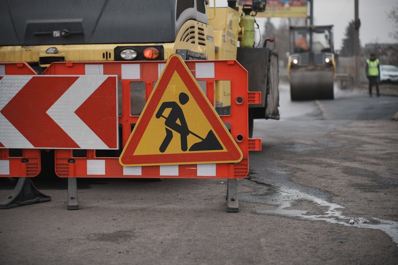 Дорожній знак попереджає водіїв про ремонт дороги, Харківщина, березень 2026 року. Суспільне Харків/Вікторія Якименко