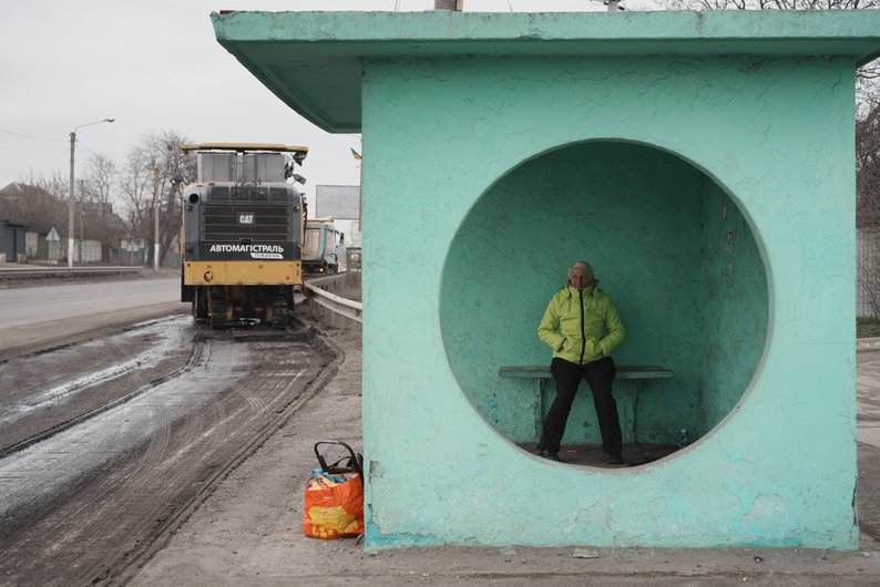 Жінка чекає транспорт на зупинці на київській трасі на Харківщині, поки поруч ремонтують дорогу, березень 2026 року. Суспільне Харків/Вікторія Якименко