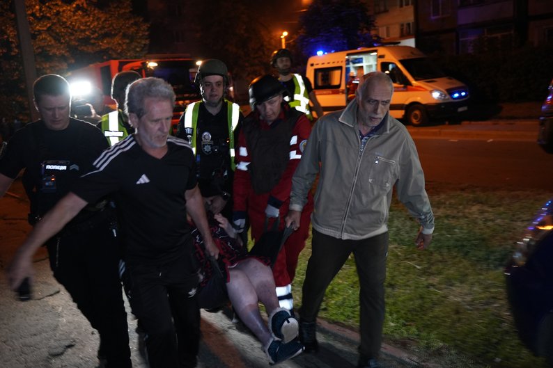 Працівник ДСНС допомагає евакуювати людей з пошкодженого будинку на Салтівці у Харкові після атаки дронів, 12 червня 2025 року. ДСНС Харківщини