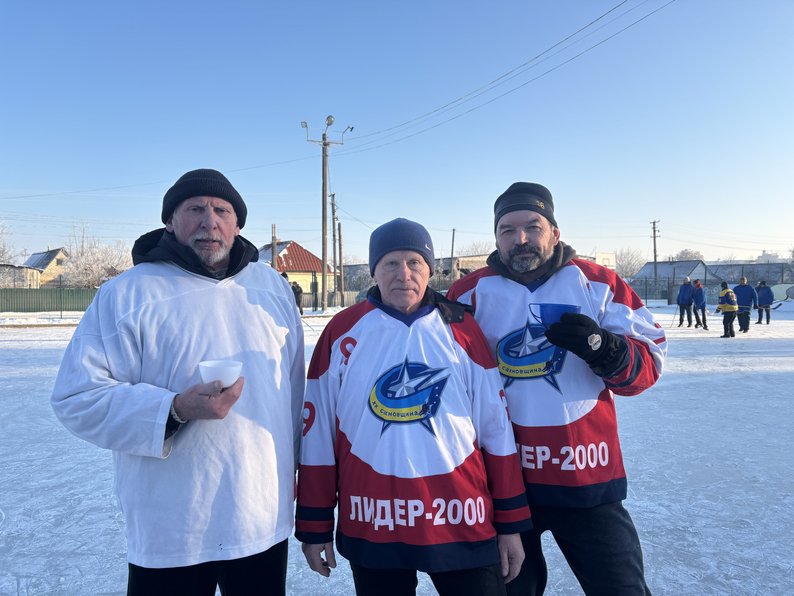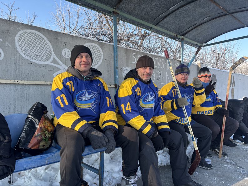 Олексій Філоненко (перший зліва) разом з гравцями аматорської команди з хокею, Сахновщина, січень 2026 року. Суспільне Харків/Інна Половко