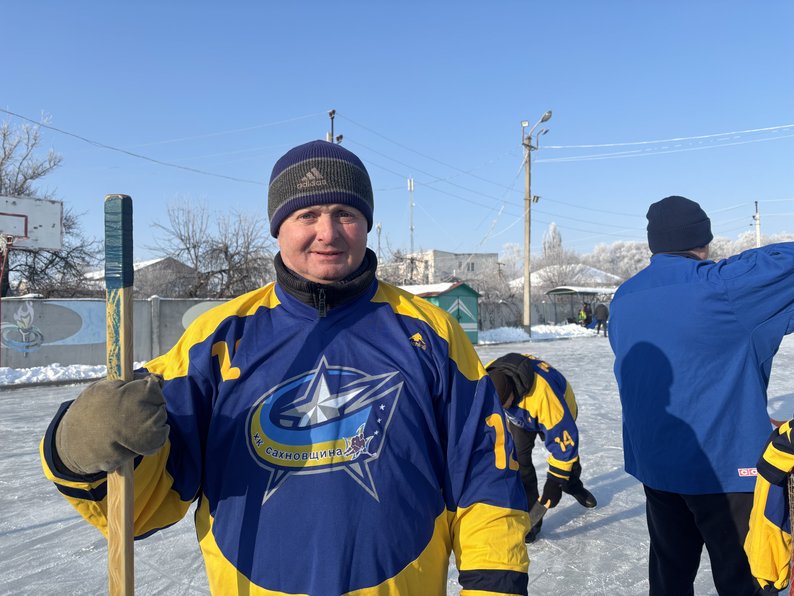 68-річний Олексій Філоненко — житель сусіднього з Сахновщиною села Германівка і найстарший гравець місцевої хокейної команди. Чоловік каже, грає у хокей з дитинства.
