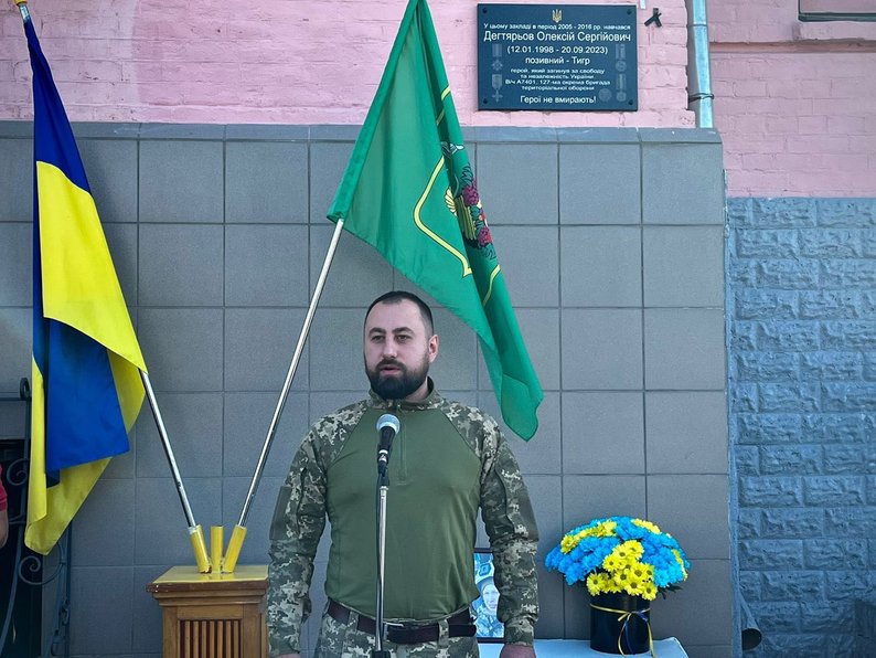 На фасаді харківської гімназії № 30 встановили меморіальну дошку полеглому випускнику 2016 року — Олексію Дегтярьову. Військовий служив у 127-й бригаді ТрО. Він поліг 20 вересня 2023 року на Запоріжжі.