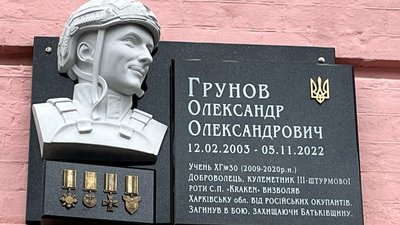 Меморіальну дошку загиблому захиснику Олександру Грунову відкрили 15 квітня на фасаді гімназії №30 у Харкові. Військовий був випускником гімназії.