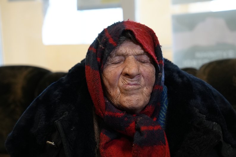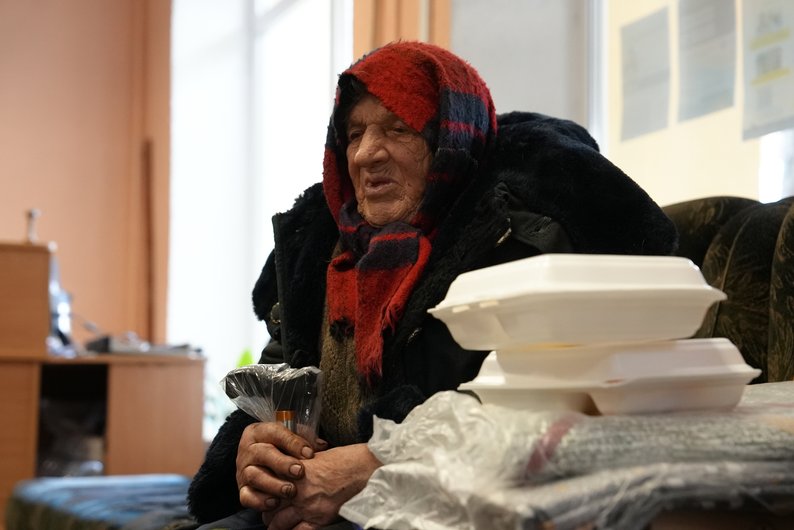 Тітка моя — у неї зору немає. Не бачить вона. Нас волонтери привезли сюди із села. Та потихеньку, дощ всю дорогу поливав.
