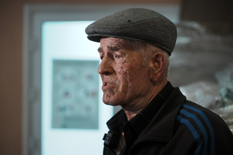 71-річний Віктор Соболєв виїхав із Купʼянська разом із дружиною Любовʼю. Він розказує — до евакуації вони жили в будинку чоловіка, який поїхав раніше, але житло зруйнували росіяни.