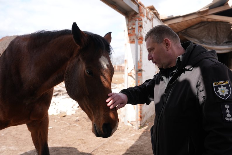 Олексій говорить, після деокупації він продовжив піклуватися кіньми, йому допомагають поліцейські офіцери громади.
