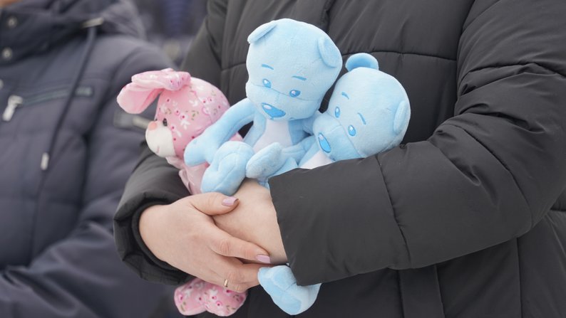 Три м’які іграшки в руках у однієї з присутніх на похованні Григорія Шикули та його трьох дітей, Сковородинівка, Харківська область, 13 лютого 2026 року. Суспільне Харків/Олександр Манченко