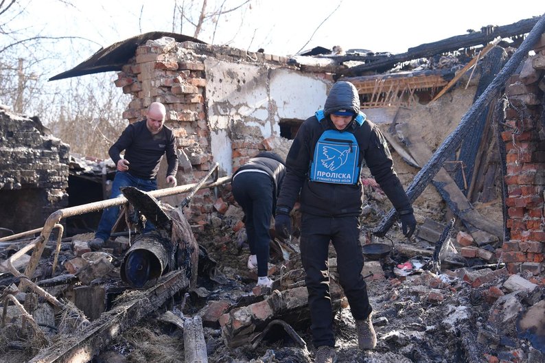 Руїни приватного будинку, де вночі 10 лютого через удар загинули батько з трьома дітьми, Богодухів, Харківська область, 11 лютого 2026 року. Суспільне Харків/Валерія Ємець