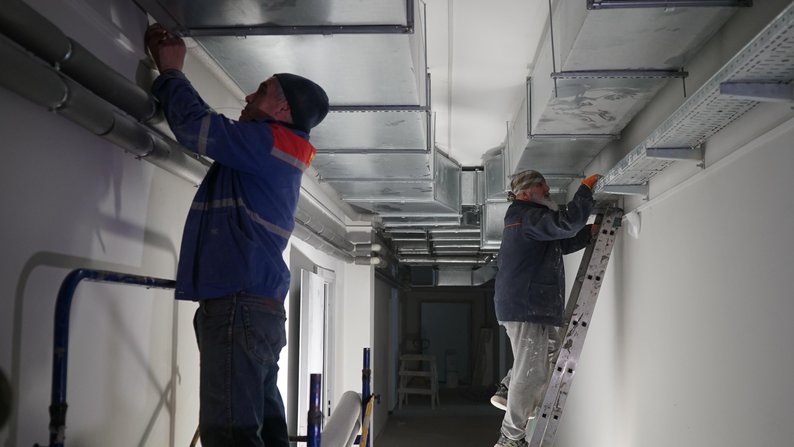 Працівники виконують роботи з облаштування підземної школи в Дергачах, жовтень 2025 року. Суспільне Харків/Валерія Ємець