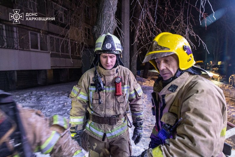 Рятувальники на місці пожежі в дев’ятиповерхівці у Харкові, 26 січня 2026 року. ДСНС Харківщини