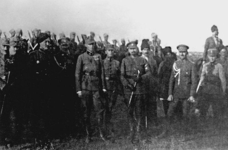 Командування Кримської групи та Українських Січових Стрільців в Олександрівську (Запоріжжя), 17 квітня 1918 року. У центрі – Вільгельм Габсбург (у чорному одязі) та Петро Болбочан (із стеком). Фото з книги Сергія Громенка “Забута перемога. Кримська операція Петра Болбочана 1918 року”