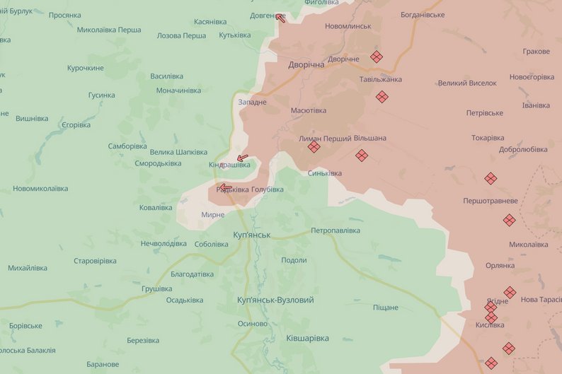 Ситуація на Куп’янському напрямку на мапі аналітичного проєкту Deepstate на 9 серпня 2025 року. Скриншот: DeepState