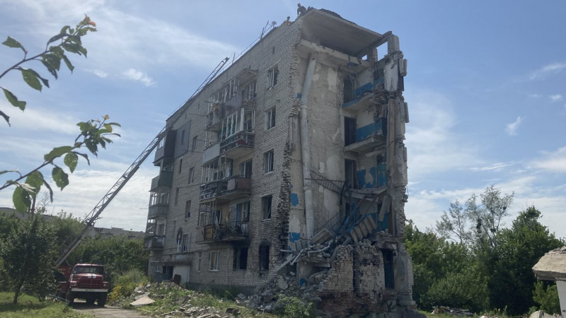 Зруйнований російським ударом будинок на вулиці Пам’яті в Ізюмі, Харківська область, 31 липня 2023 року. Фото: Суспільне Харків