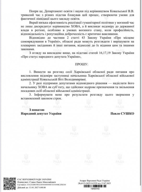 Депутатське звернення Павла Сушка до голови Харківської обласної ради Тетяни Єгорової-Луценко. Павло Сушко/Facebook