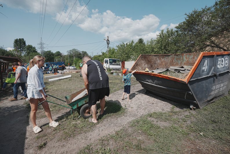 У Холодногірському районі Харкова жителі та комунальники прибирають наслідки влучань російських безпілотників на світанку 2 червня 2025 року. Суспільне Харків/Вікторія Якименко