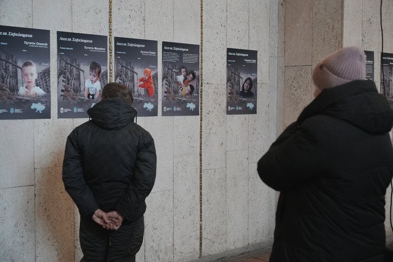 Відвідувачі виставки “Ангели Харківщини” дивляться на фото дітей, які загинули через російські атаки, Харків, 3 грудня 2025 року. Суспільне Харків/Вікторія Якименко