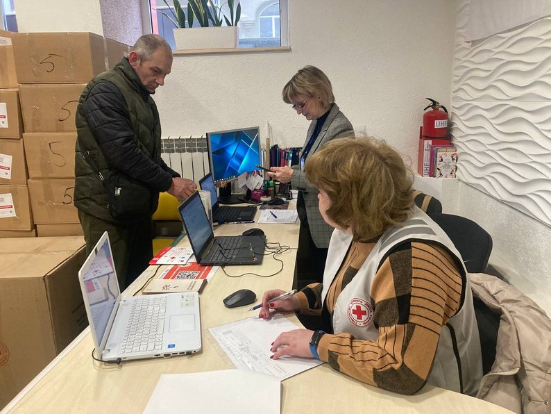 Представниця Червоного хреста України Тетяна Гончарова — одна з тих, хто від своєї організації видає гуманітарну допомогу. Суспільне Харків/Роман Кривко