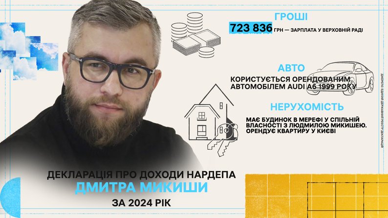 У декларації за 2021 рік Микиша, крім будинку в Мерефі, показав квартиру 62,42 кв. м, яку орендував у столиці. Нардеп користувався орендованим автомобілем Audi А6 1999 року.