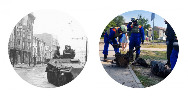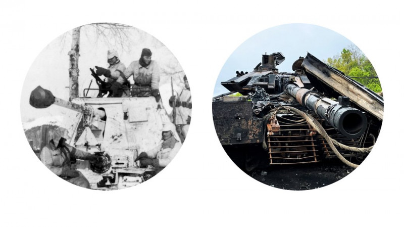 Німецька окупація Харкова 40-х рр. і наші дні: знищена техніка окупантів РФ у Малій Рогані на Харківщині та звалище російських боєприпасів у Харкові, зібраних з місць обстрілів РФ. Джерела фото: Bundesarchiv та Суспільне Харків