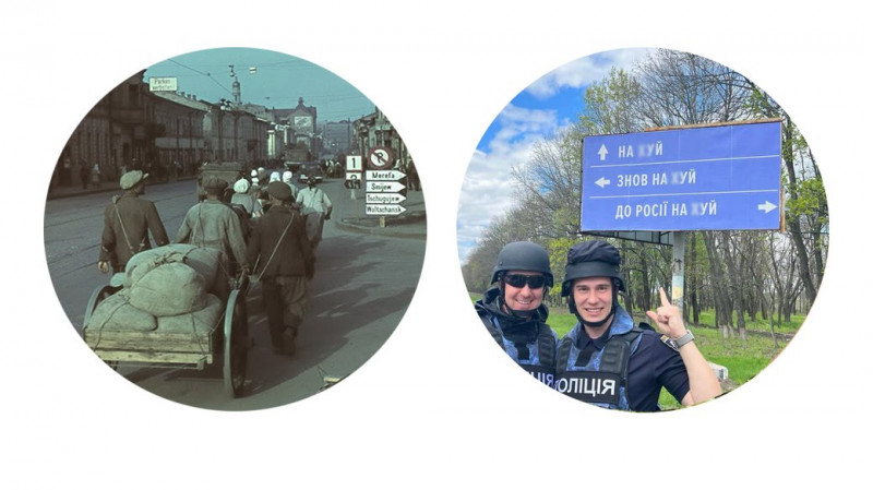 Вказівники під час німецької окупації Харкова та після вторгнення РФ в Україну. Джерела фото: ww2db.com/Johannes Hähle | Cергій Болвінов/Facebook