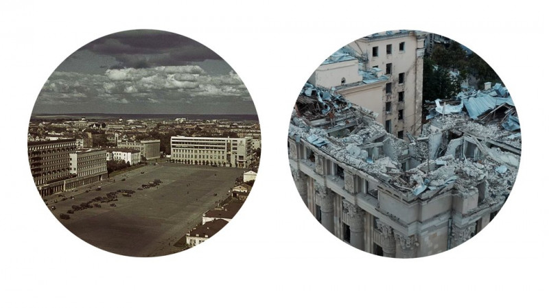 Харків під час Другої світової війни і Харків після бомбардувань міста армією РФ у 2022-му. Джерела фото: Bundesarchiv | Cуспільне Харків
