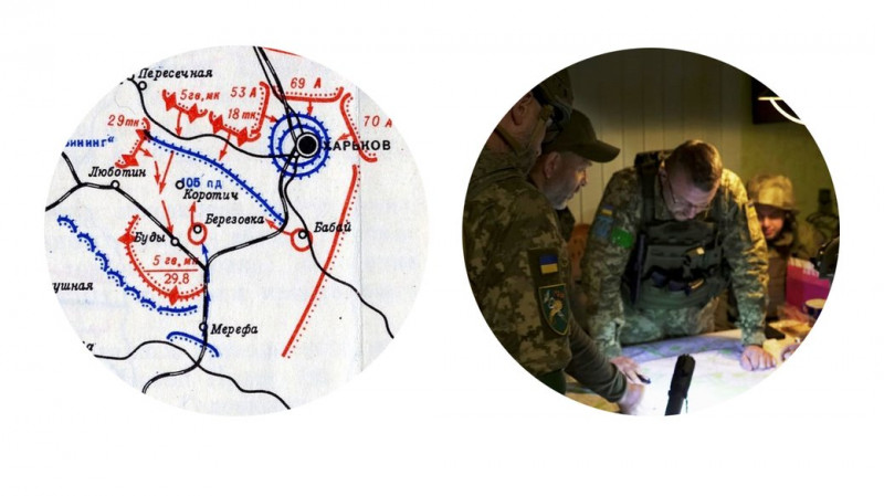 Фрагмент схеми звільнення від німців Коротича на підступах до Харкова, серпень 1943. Українські захисники планують дії зі звільнення населених пунктів Харківщини від окупантів РФ, весна 2022 р. Джерела фото: otkudarodom.ua | Cуспільне Харків