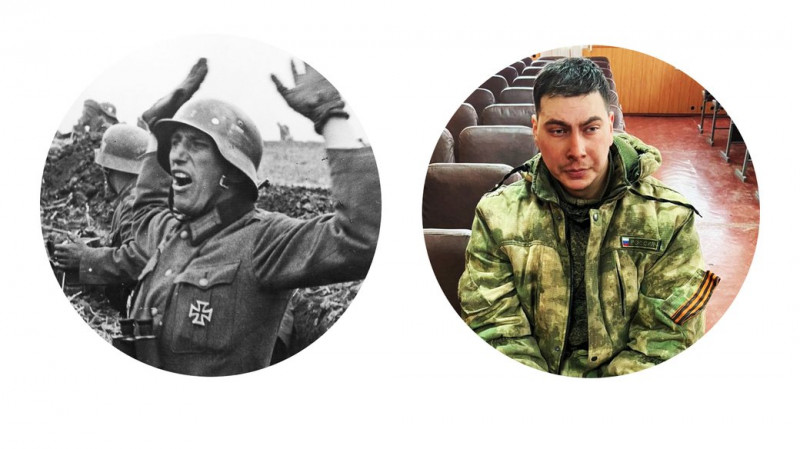 Німецький солдат під час окупації Харкова. Російський полонений на Харківщині, 2022 р. Джерела фото: Bundesarchiv | Поліція Харківщини