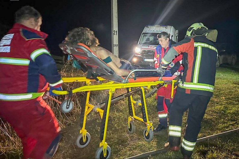 Рятувальниик надають допомогу чоловіку, якого витягнули з осередку пожежі, Харківська область, 4 квітня 2025 року. ДСНС Харківщини