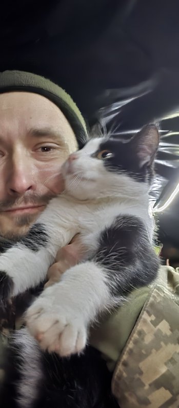 Боєць 129-ї ОМБр “Фрукт” із кішкою. Фото надав військовий “Фрукт”