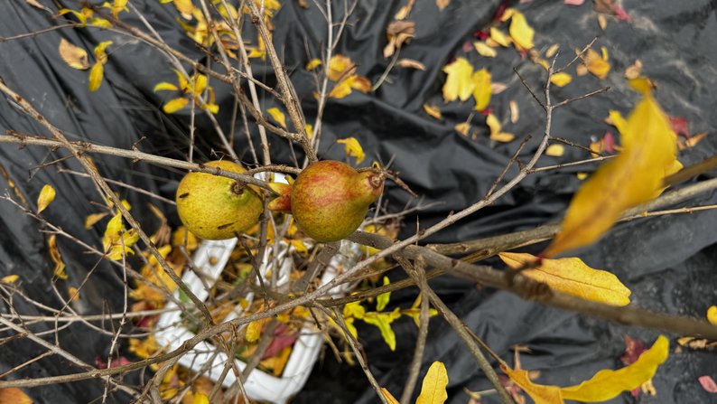 Гранати, вирощені в пластиковому контейнері. Суспільне ХарківВони дають плоди навіть попри несприятливі погодні умови. У нас було три хвилі приморозків. Потім таке літо не дуже сприятливе. Попри це отримали такий от перший врожай. З кожним роком врожайність буде збільшуватися. Це перше плодоношення, і то ще не на всіх сортах є. На той рік ми сподіваємося, буде більше, а потім — ще більше. На зиму треба цю рослину заносити у льох, або у прохолодне приміщення, щоб температура там була не мінусова.