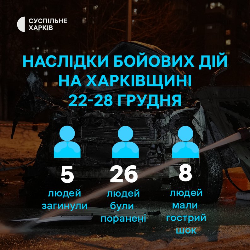 Минулого тижня на Харківщині через російські удари загинули п'ятеро людей. Ще 26 людей дістали поранень, а п'ять — гострого шоку. Також до лікарні ушпиталили жительку Куп'янська, яка була поранена 20 грудня.