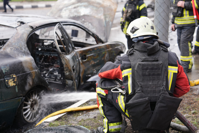 Рятувальник гасить пожежу в автівці, яка сплахнула внаслідок удару РФ біля Центрального парку у Харкові, 3 квітня 2026 року. Суспільне Харків/Олександр МанченкоПоруч розташована лікарня. Вона так само пошкоджена. Зараз наші служби будуть зашивати вікна для того, щоб ліквідувати наслідки.