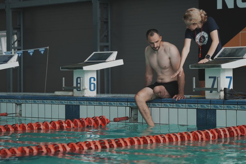 Призер Паралімпійських ігор Максим Крипак. Суспільне Харків/Вікторія ЯкименкоЗвісно ж, ми спочатку з хлопцями спілкуємося, знайомимося, дізнаємося, які саме у них проблеми, що вони вже проходили з реабілітації, що їм порекомендував лікар надалі робити, й саме це реалізуємо тут. Якщо хлопцям стає цікавим саме спортивне плавання — ми їх навчаємо та сподіваємося, що вони приєднаються до змагань, які вже потроху проводять в Україні. Є хлопці, які у досить дорослому віці не вміли плавати, 35 років і старше. Спочатку мали дискомфорт, але потім потроху-потроху починали себе розганяти.