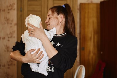 Вона розвивається по годинах, мені здається. Почала голову тримати, десь три-чотири дні тому, я дуже здивувалась. Робимо з нею зарядку, вона намагається як повзати. Я з нею постійно спілкуюсь. Як тільки плаче навіть, я кажу: "Катюша, заспокойся, зараз мама тобі дасть їсти". Вона чує голос і все, тихо мовчить.