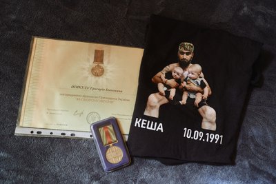 Нагорода та футболка чоловіка Григорія, які вціліли після російського удару по будинку в Богодухові. Суспільне Харків/Вікторія Якименко